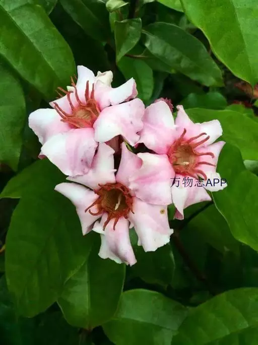粗壮常绿攀援灌木,全株无毛;枝条干后红褐色,具白色皮孔,老枝条具纵条纹。叶厚纸质,长圆形或长圆状椭圆形,长9-15厘米,宽4-7.5厘米,顶端急尖,基部圆形或阔楔形;中脉在叶面扁平,在叶背凸起,侧脉每边6-8条,两面均扁平;叶柄长约1厘米,扁平;叶腋内具2枚钻状腺体。聚伞花序顶生,伞形,具短总花梗,着花6-8朵,无毛;花萼钟状,裂片倒卵形,长12毫米,宽6毫米,花萼内面基部有12枚腺体;花冠白色,喉部染红色,花张开后直径5厘米,花冠裂片倒卵形,顶端不延长成尾状,花冠筒上部膨大;副花冠为10枚舌状鳞片所组成,着生在冠檐喉部,鳞片基部合生,顶端离生并伸出花喉外,红色;雄蕊内藏,花药靠合在柱头上,药隔顶端丝状,花丝离生,被微毛;子房卵圆状,无毛,花柱丝状,柱头棍棒状。花期2月。