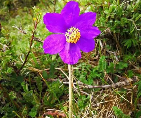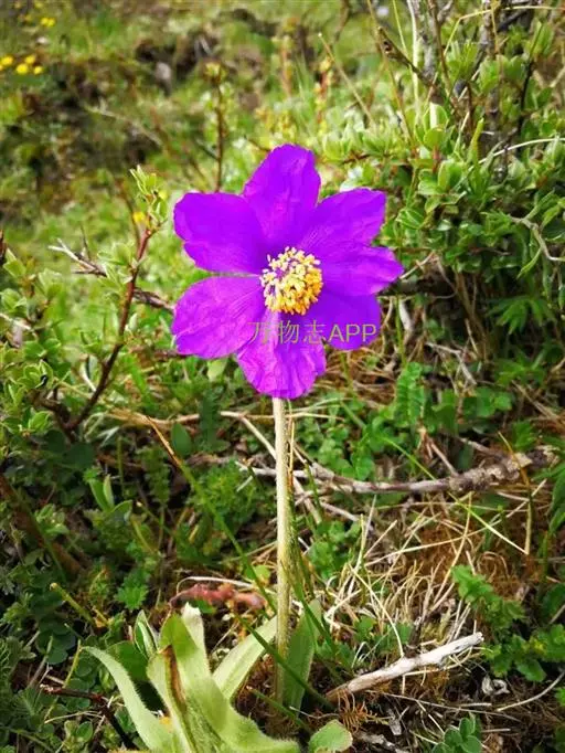 一年生草本。主根短而肥厚,圆锥形,长4-6厘米,粗约1厘米。叶全部基生,叶片倒披针形或长圆状倒披针形,长3-8厘米,宽0.5-1.5厘米,先端钝或圆,基部渐狭而入叶柄,边缘全缘或波状,稀具疏锯齿,两面被黄褐色、卷曲的硬毛;叶柄线形,长2-6厘米。花葶高15-20厘米,被黄褐色平展、反曲或卷曲的硬毛。花1(-11)朵,单生于基生花葶上;花芽宽卵形,长的1厘米,宽约1.5厘米;萼片边缘薄膜质,外面被黄褐色、卷曲的硬毛;花瓣5-9,卵形或倒卵形,长4-5厘米,宽2-3.8厘米,先端圆或钝,深蓝紫色或紫色;花丝上部1/3丝状,下部2/3突然扩大成条形长约1.5厘米,与花瓣同色,花药长约1毫米,橘红色或浅黄色;子房卵珠形或近球形,长约5毫米,密被黄褐色紧贴的硬毛,花柱长约5毫米,柱头长约5毫米,裂片分离或连合成棒状。蒴果椭圆状长圆形或狭倒卵珠形,长约2厘米,疏被硬毛,4-6瓣自顶端微裂。种子镰状长圆形,种皮具纵条纹或浅凹痕。花果期6-9月。