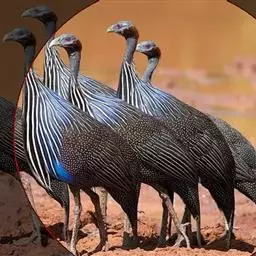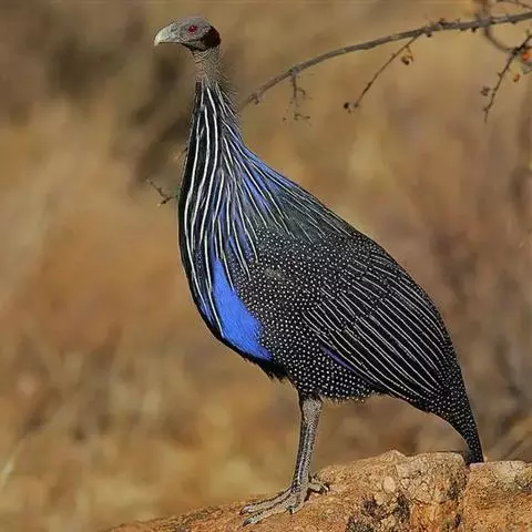 鹫珠鸡:是珠鸡科中体形最大的一种,因头颈部像兀鹫而得名。雌雄羽色相似,为黑色基底上遍布白色点斑,…