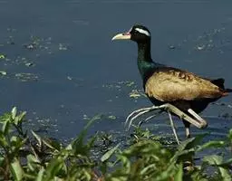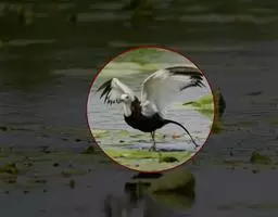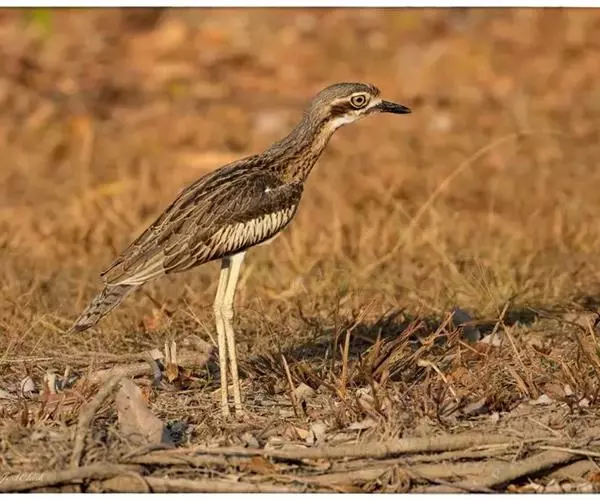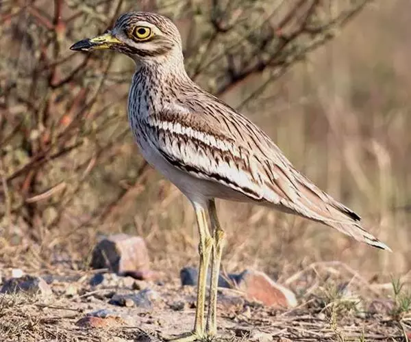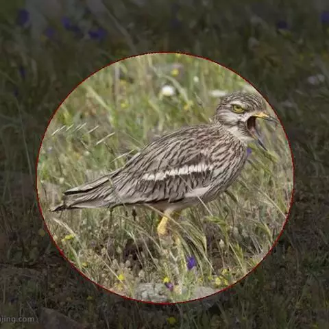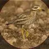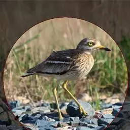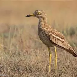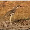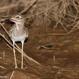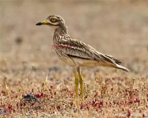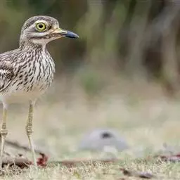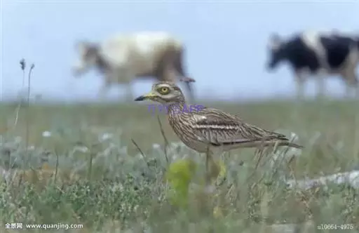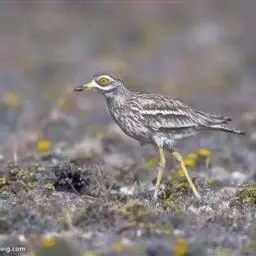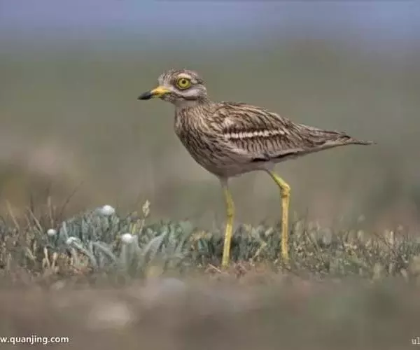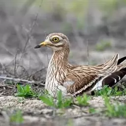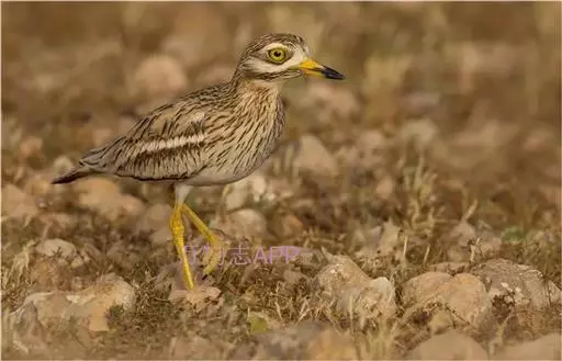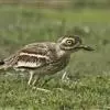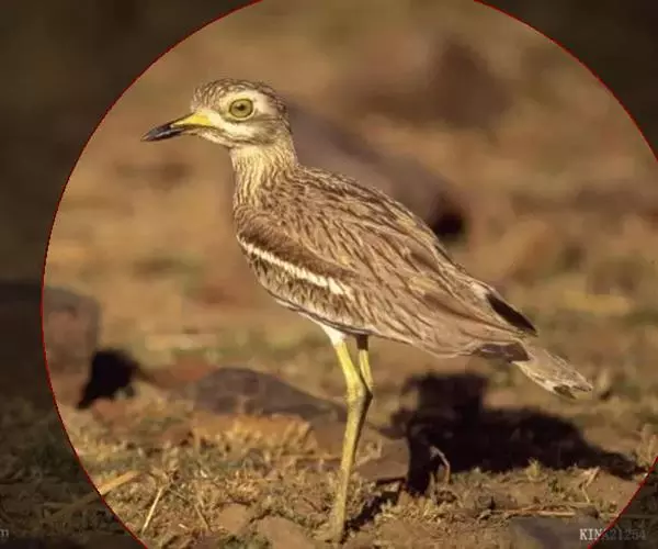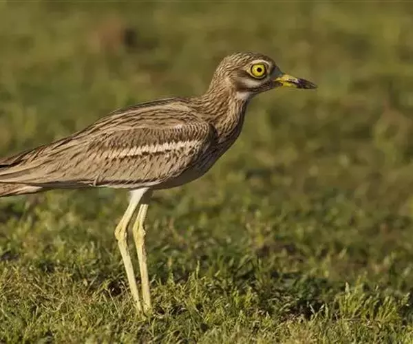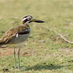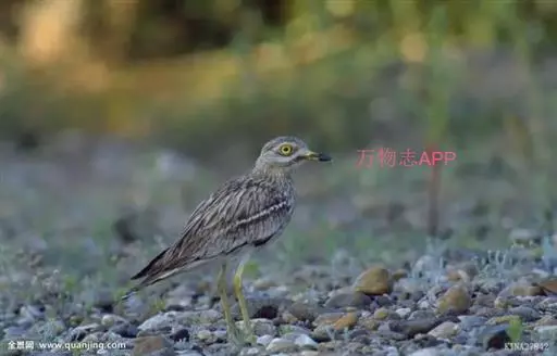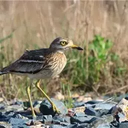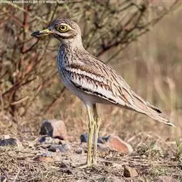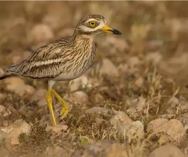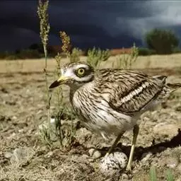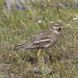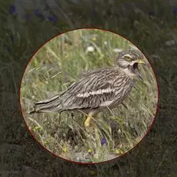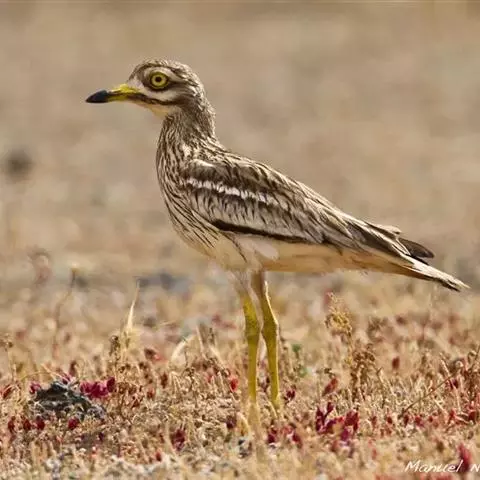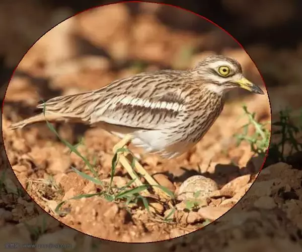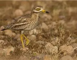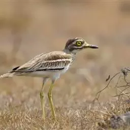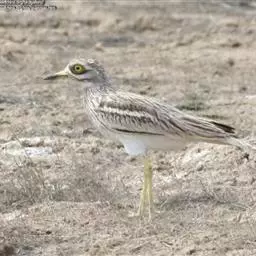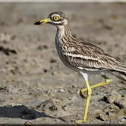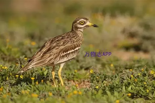 石鸻(学名:Burhinus oedicnemus),是石鸻科、石鸻属的中型涉禽,体长40-45厘米。嘴粗厚、尖端黑色,基部黄色。脚长而粗、黄色,3趾,后趾缺失。上体淡沙灰褐色具黑褐色纵纹,前额和眼先白色。眼特别大、黄色,其外有一窄的黑圈,再外又围有更宽的白色并向后延伸,形成一道显著的白眉,在上下缘的黑色带斑衬托下极为醒目。在背的两侧靠近翅处,有一白色和黑褐色纵带。下体污白色,前颈和胸缀有皮黄灰色亦具黑纹,飞翔时黑色初级飞羽上有白斑,翅下白色。