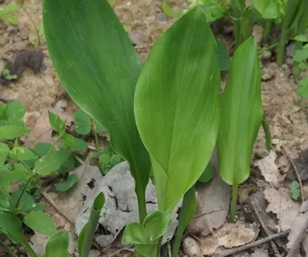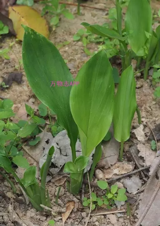 株高15~30厘米;根茎块状,径约1厘米,外面棕褐色,内面棕黄色,粉质,芳香而有辛辣味,根末端膨大成球形的块根。叶片倒卵状长圆形或披针形,长10~18厘米,宽2~3.5 厘米,绿色或染紫;叶柄长6~18厘米。花10~15朵聚生于钟状的总苞中,总苞长4~5厘米,宽2~2.5厘米,顶2~3裂,总苞及花的各部常有棕色、透明的小腺点;总花梗长2.5~10厘米;小苞片线形,膜质,长约1.5厘米;花白色,萼管长9~11毫米,顶端浅3裂;花冠管长2.5~2.7厘米,裂片长圆形,长约1.2厘米,后方的一片稍较大,顶端具小尖头;侧生退化雄蕊倒披针形,长1.6~2厘米,宽约4毫米;唇瓣倒卵状匙形,长约2厘米,上部宽1.3厘米,深裂至5毫米处,白色,中央有杏黄色斑,内被长柔毛,生活时唇瓣与侧生退化雄蕊卷成筒状,露出于总苞之上;花药长5毫米,花丝长2 毫米;药隔附属体半圆形,长约3毫米;花柱线形,柱头具缘毛;子房卵形,长3.5毫米。花期:5~6月。
