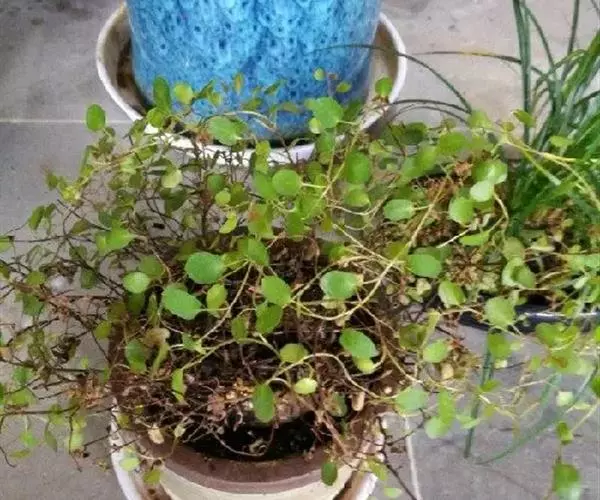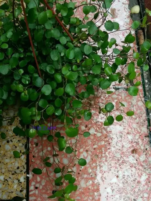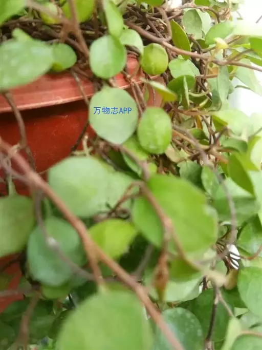 千叶吊兰植株匍匐丛生或呈悬垂状生长,细长的茎红褐色。小叶互生,叶片心形或圆形。其株形饱满,枝叶婆娑,具有较高的观赏价值,适合作吊盆栽种或放在高处的几架、柜子顶上,茎叶自然下垂,覆盖整个花盆,犹如一个绿球,非常好看。