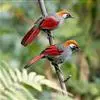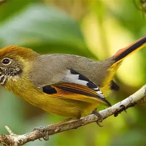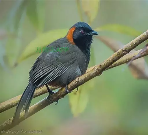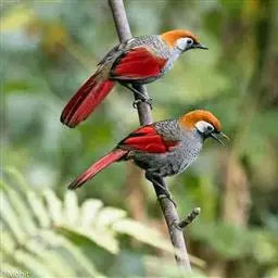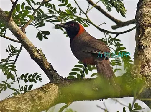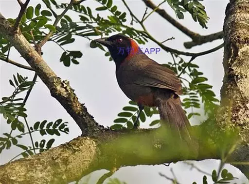 赤尾噪鹛中型鸟类,体长24~28厘米。头顶至后颈红棕色,两翅和尾鲜红色,眼先、眉纹、颊、颏和喉黑色,…