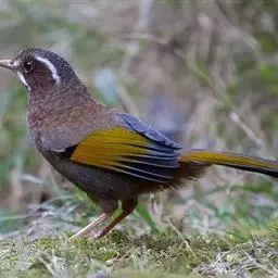 玉山噪鹛中等体型的褐色鸟类。白色长眉纹及髭纹显著;顶冠灰而具白色的鳞状斑纹;脸侧及颏褐色,…