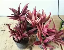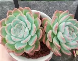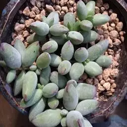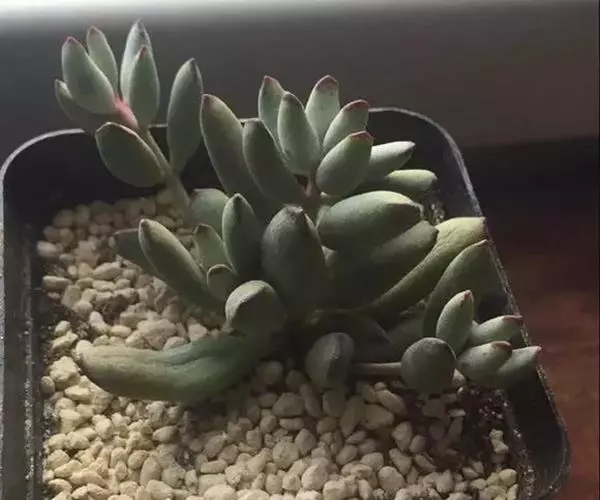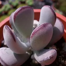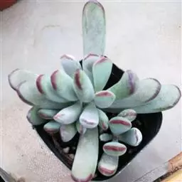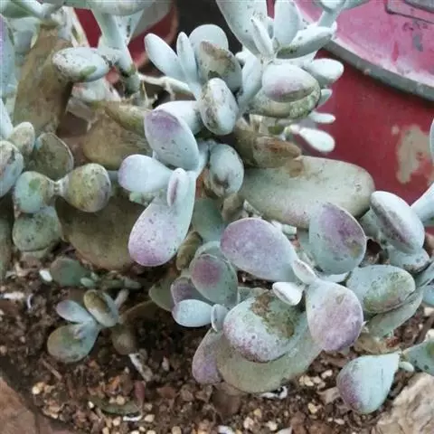 福娘为景天科银波锦属的肉质草本植物。对生的叶片呈短棒状,叶色灰绿,表覆白粉,叶缘外围镶着紫红色,…