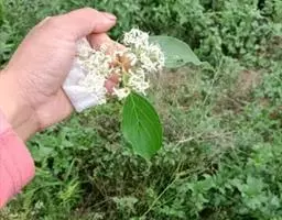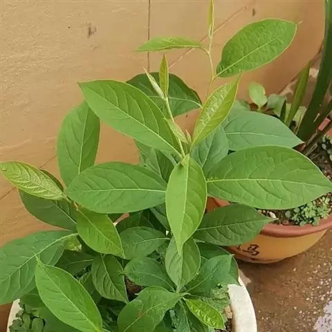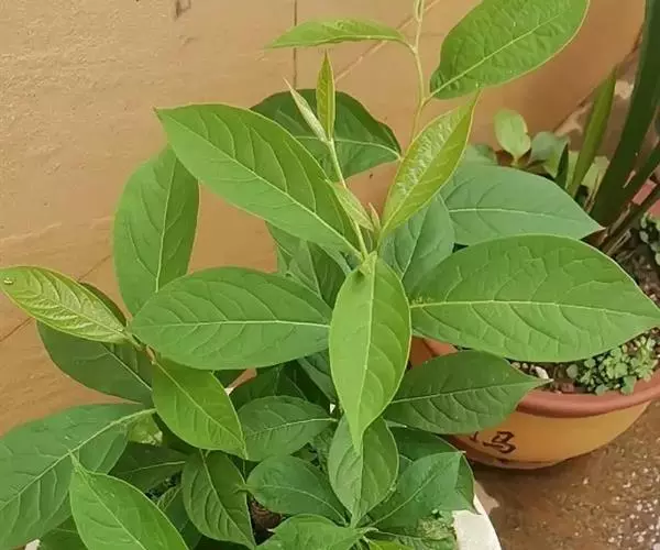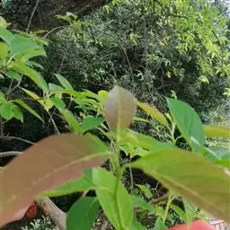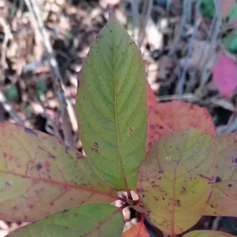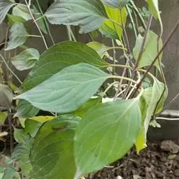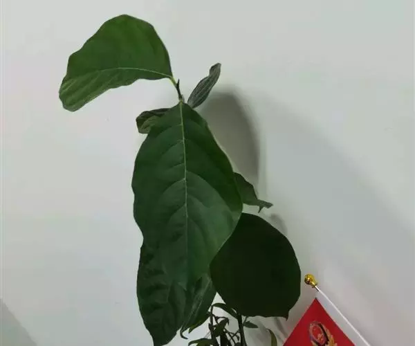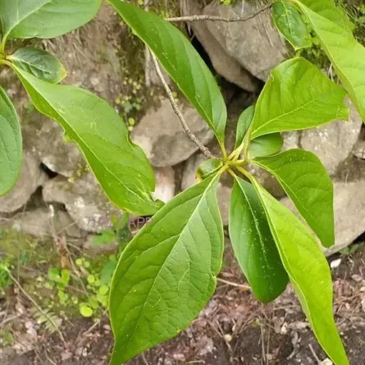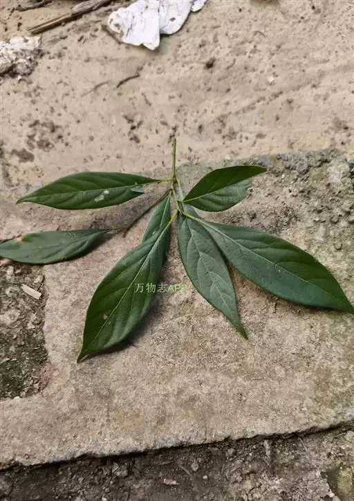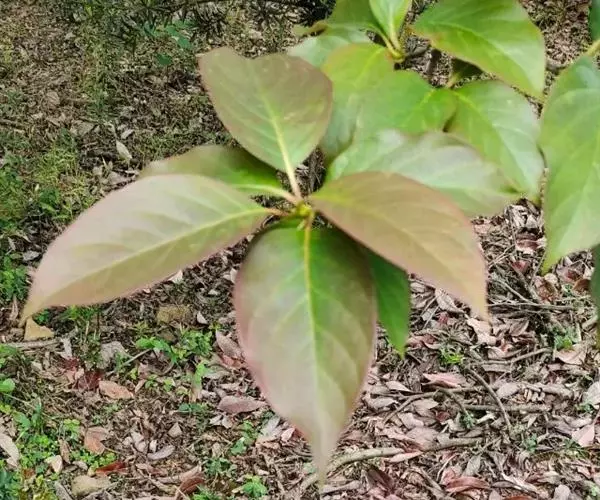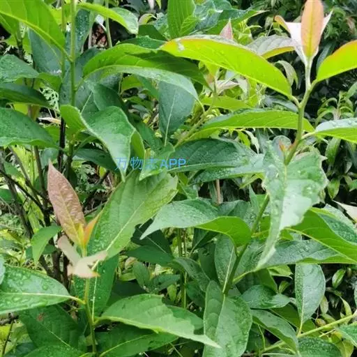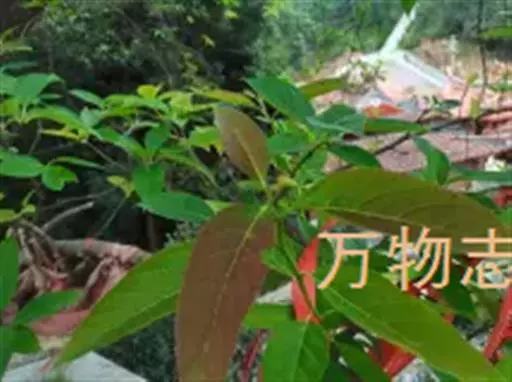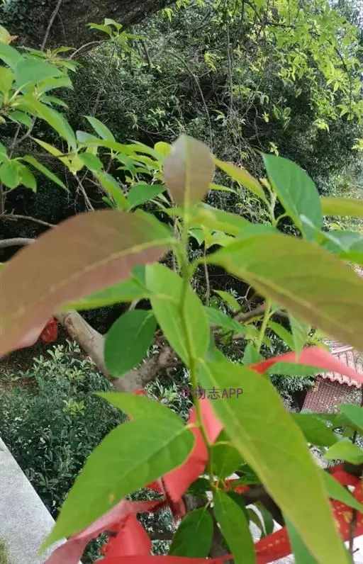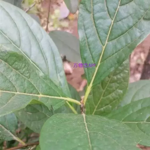 叶纸质或薄革质,互生,椭圆形或长椭圆形,稀卵形或近披针形,长12-15厘米,宽5-6厘米,稀达8厘米,顶端短急锐尖,基部近圆形,边缘略呈浅波状,上面无毛,深绿色,干燥后深紫色,下面淡绿色,有很稀疏的微柔毛,中脉和6-10对侧脉均在上面微现,在下面显著;叶柄淡紫绿色,长1.5-2厘米,上面稍扁平或微呈沟状,下面圆形。
