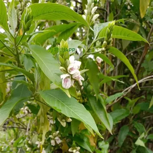 大灌木,高达1-3米;枝圆柱状,灰色,有皮孔,嫩枝密被灰白色微柔毛。叶纸质,矩圆状披针形至披针形,或卵形或椭圆状卵形,长15-20厘米,宽4.5-7.5厘米,顶端渐尖,有时稍呈尾状,基部阔楔形,全缘,上面近无毛,背面被微柔毛;中脉在上面具槽,侧脉每边约12条;叶柄长1.5-2厘米。茎叶揉后有特殊臭气。穗状花序卵形或稍伸长;花梗长5-10厘米;苞片卵形或阔卵形,长1-3厘米,宽8-15毫米,被微柔毛;小苞片披针形,稍短于苞片,萼裂片5,矩圆状披针形,长约8毫米;花冠白色,有紫色条纹或粉红色,长2.5-3厘米,被柔毛,冠管卵形,长约6毫米;药室椭圆形,基部通常有球形附属物不明显。蒴果近木质,长约0.5厘米,上部具4粒种子,下部实心短柄状。 [1-2]