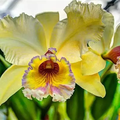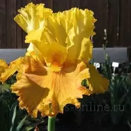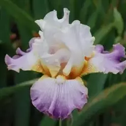 球根花卉,叶披针形、对折,基部为鞘状,全缘,中肋明显,光滑,绿色,有光泽,成熟期叶片8~11枚;双花茎,花顶生,着花1~2朵,花茎长50.0~75.0厘米、粗0.75~1.10厘米;花蝶形辐射对称,花径11.0~16.0厘米;垂瓣3枚,心形,黄色,具琴状瓣柄,中央部具匙形橙黄色条斑,瓣缘向下弯垂,长7.0~11.5厘米、宽3.0~5.0厘米;旗瓣3枚,长椭圆形,斜立,白色中略带淡紫色,长6.0~11.0厘米、宽2.0~3.0厘米;地下球茎卵圆形,外被褐色皮膜;每粒母球茎花后可形成1粒卵圆形中心球和4~7粒子球,平均繁殖系数达5.54;成熟开花商品球茎周径8~12厘米,少数可达14厘米。株高约60-80公分,地下麟茎,植株与唐昌蒲相类似,单叶丛生,叶形为长披针形,先端尖细,基部为鞘状,叶片长出6~7枚,抽出单一花茎,花形姿态优美,有三瓣花瓣,为单顶花序,花色有金、白、蓝及深紫色。