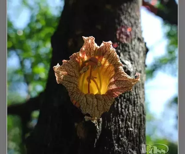 花1-2朵生于小枝或老茎上;花梗长约1厘米。花萼2裂达基部,淡紫色。花冠褐色,具有紫褐色脉纹,近钟状,具褶皱,喉部常膨胀成淡囊状,长5-7厘米,檐部成五角形。雄蕊4,插生于花冠筒下部,花药个字形着生,外露。花盘环状,淡黄色。花柱长6厘米,柱头薄片状,2裂;子房淡黄色。果近球形,直径5-7厘米,光滑,不开裂,淡绿色。