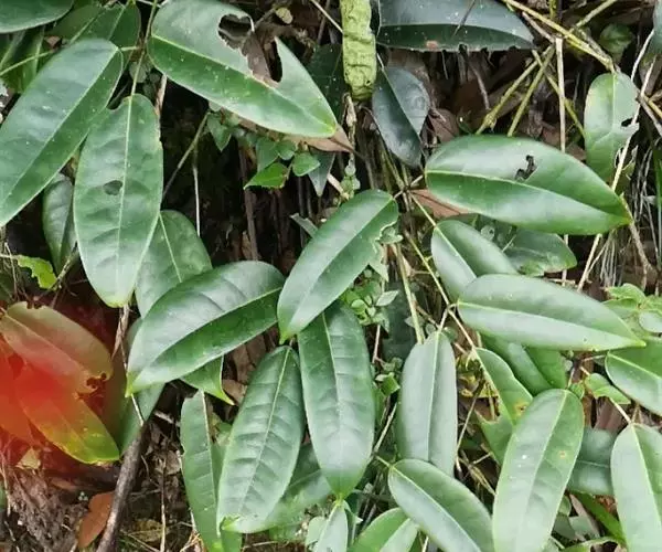 鹰爪枫,又名大叶青藤、山爪藤。常绿木质藤本。茎皮褐色。掌状复叶有小叶3片;叶柄长3.5-10厘米;小叶厚革质,椭圆形或卵状椭圆形,较少为披针形或长圆形,顶小叶有时倒卵形,长(2)6-10(15)厘米,宽(1)4-5(8)厘米,先端渐尖或微凹而有小尖头,基部圆或楔形,边缘略背卷,上面深绿色,有光泽,下面粉绿色;中脉在上面凹入,下面凸起,基部三出脉,侧脉每边4条,与网脉在嫩叶时两面凸起,叶成长时脉在上面稍下陷或两面不明显;小叶柄长5-30毫米。花雌雄同株,白绿色或紫色,组成短的伞房式总状花序;总花梗短或近于无梗,数至多个簇生于叶腋。雄花:花梗长约2厘米;萼片长圆形,长约1厘米,宽约4毫米;顶端钝,内轮的较狭;花瓣极小,近圆形,直径不及1毫米;雄蕊长6-7.5毫米,药隔突出于药室之上成极短的凸头,退化心皮锥尖,长约1.5毫米。雌花:花梗稍粗,长3.5-5厘米;萼片紫色,与雄花的近似但稍大,外轮的长约12毫米,宽7-8毫米;退化雄蕊极小,无花丝;心皮卵状棒形,长约9毫米。果长圆状柱形,长5-6厘米;直径约3厘米,熟时紫色,干后黑色,外面密布小疣点;种子椭圆形,略扁平,长约8毫米,宽5-6毫米,种皮黑色,有光泽。花期4-5月,果期6-8月。
