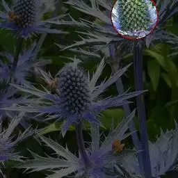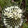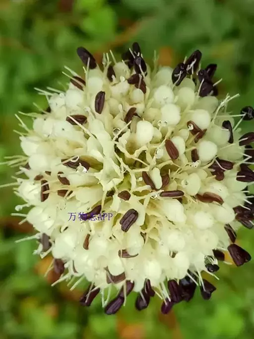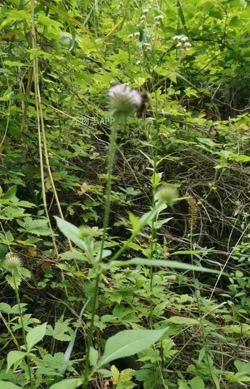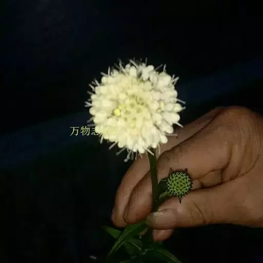 头状花序球形,径2-3厘米,总花梗长达55厘米;总苞片5-7枚,叶状,披针形或线形,被硬毛;小苞片倒卵形,长7-11毫米,先端稍平截,被短柔毛,具长3-4毫米的喙尖,喙尖两侧密生刺毛或稀疏刺毛,稀被短毛;小总苞四棱倒卵柱状、每个侧面具两条纵纵沟;花萼四棱、皿状、长约1毫光、不裂或4浅裂至深裂,外面被短毛;花冠淡黄色或白色,花冠管长9-11毫米,基部狭缩成细管,顶端4裂,1裂片稍大,外面被短柔毛;雄蕊4,着生于花冠管上,明显超出花冠,花丝扁平,花药椭圆形,紫色;子房下位,花柱通常短于雄蕊,柱头短棒状。