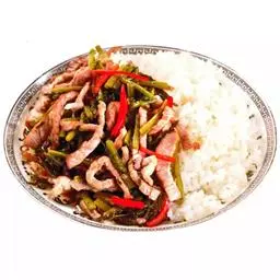 4、锅内留底油,待热后依次放入洋葱、青红椒翻炒片刻后,加入香米饭,炒匀