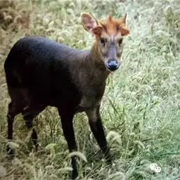 黑麂是偶蹄目鹿科鹿属哺乳动物,又名别称青麂、红头青麂、乌金麂、蓬头麂。体型较大,体长约1米,…