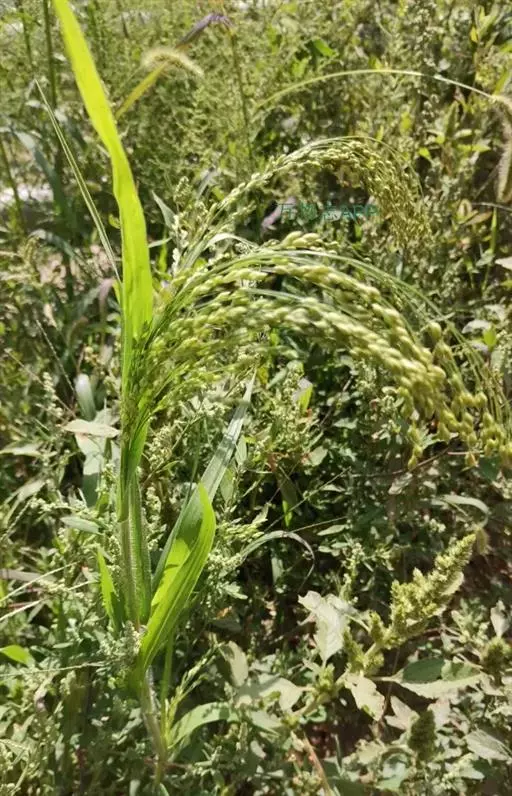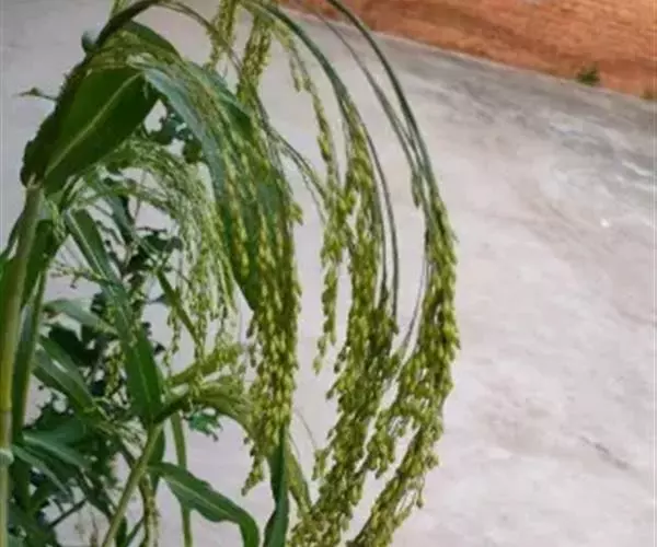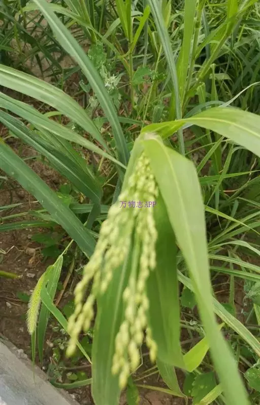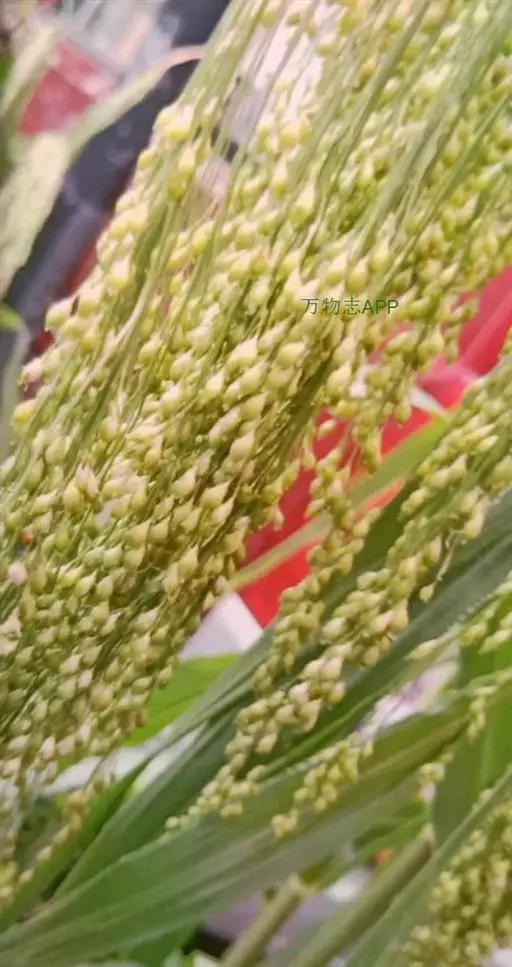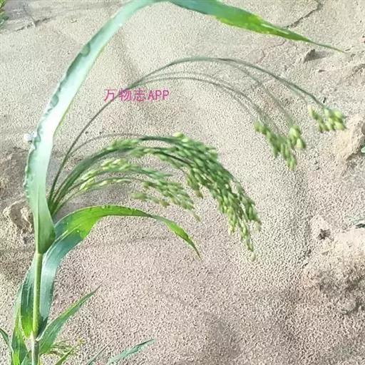 圆锥花序开展或较紧密,成熟时下垂,长10-30厘米,分枝粗或纤细,具棱槽,边缘具糙刺毛,下部裸露,上部密生小枝与小穗;小穗卵状椭圆形,长4-5毫米;颖纸质,无毛,第一颖正三角形,长约为小穗的1/2-2/3,顶端尖或锥尖,通常具5-7脉;第二颖与小穗等长,通常具11脉,其脉顶端渐汇合呈喙状;第一外稃形似第二颖,具11-13脉;内稃透明膜质,短小,长1.5-2毫米,顶端微凹或深2裂;第二小花长约3毫米,成熟后因品种不同,而有黄、乳白、褐、红和黑等色;第二外稃背部圆形,平滑,具7脉,内稃具2脉;鳞被较发育,长0.4-0.5毫米,宽约0.7毫米,多脉,并由1级脉分出次级脉。胚乳长为谷粒的1/2,种脐点状,黑色。花果期7-9月。
