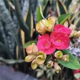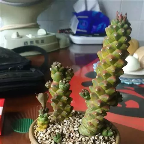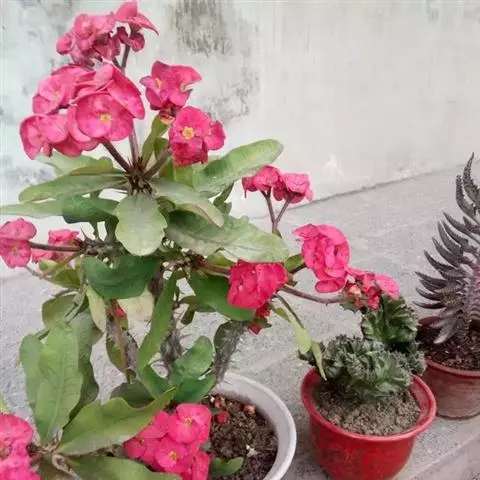 虎刺梅:别称铁海棠,是蔓生灌木植物。茎多分枝,长60-100厘米,直径5-10毫米,具纵棱,密生硬…