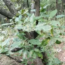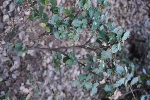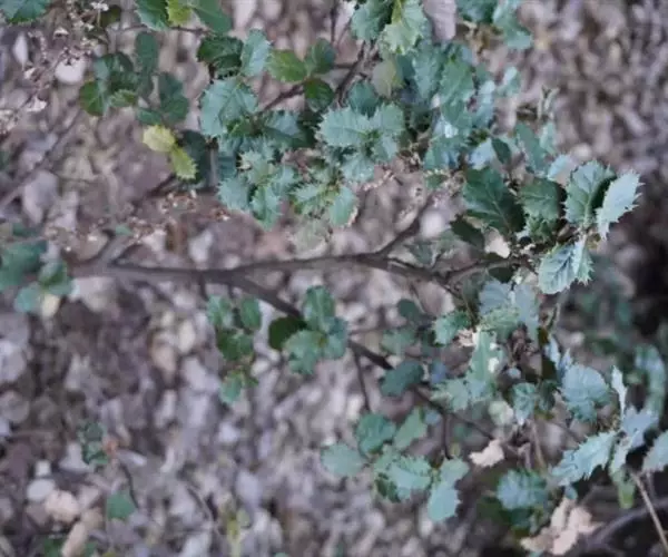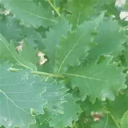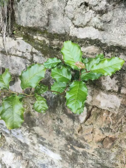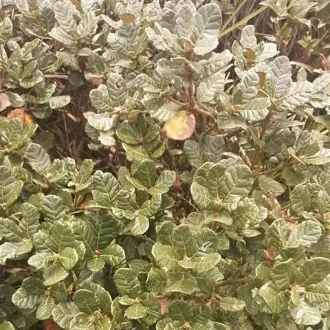 刺叶高山栎 常绿乔木或灌木,高达15米。小枝幼时被黄色星状毛,后渐脱落。叶面皱褶不平,叶片倒卵形、椭圆形,长2.5-7厘米,宽1.5-4厘米,顶端圆钝,基部圆形或心形,叶缘有刺状锯齿或全缘,幼叶两面被腺状单毛和束毛,老叶仅叶背中脉下段被灰黄色星状毛,其余无毛,中脉、侧脉在叶面均凹陷,中脉之字形曲折,侧脉每边4-8条;叶柄长2-3毫米。