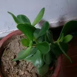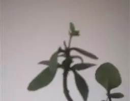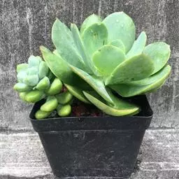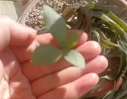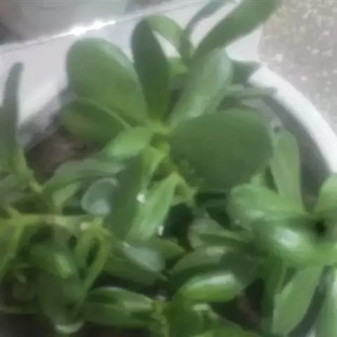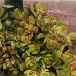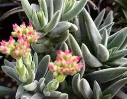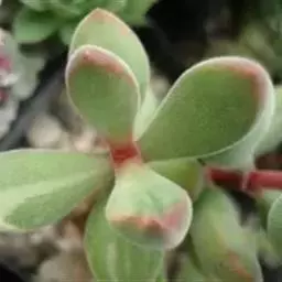 植株呈亚灌木状,高约60厘米,具小分枝,茎肉质,以后稍木质化。肉质叶灰绿 至浅绿色,叶缘稍具红色,交互对生,卵圆状三角形,无叶柄,基部连在一起,幼叶上下叠生,成叶上下有少许间隔。叶长1.5~2.5厘米,宽0.9~1.3厘米,花白色,4~5月开放。