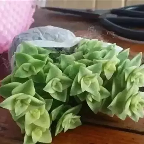 星乙女(学名:Crassula perforata Thunb.)景天科,青锁龙属多年生肉质草本,植株呈亚灌木状,具细小的分枝,茎肉质,以后稍木质化,肉质叶灰绿至浅绿色,交互对生,卵圆状三角形,无叶柄, 基部连在一起,幼叶上下叠生,成叶上下有少许间隔。叶缘稍具红色。花白色4~5月开放。
