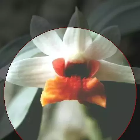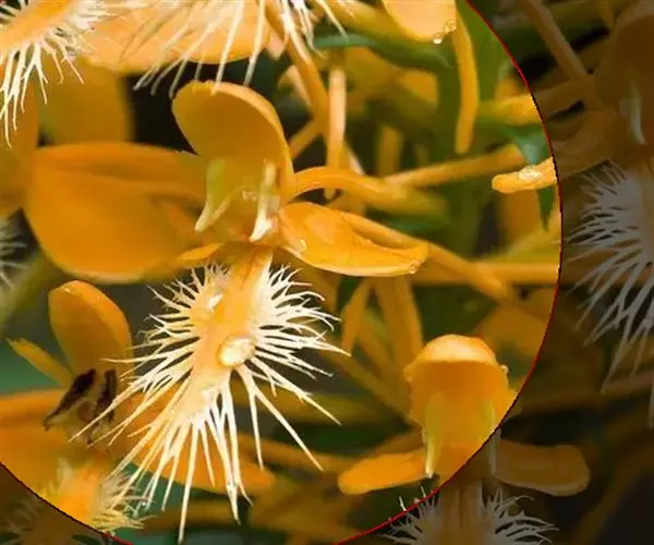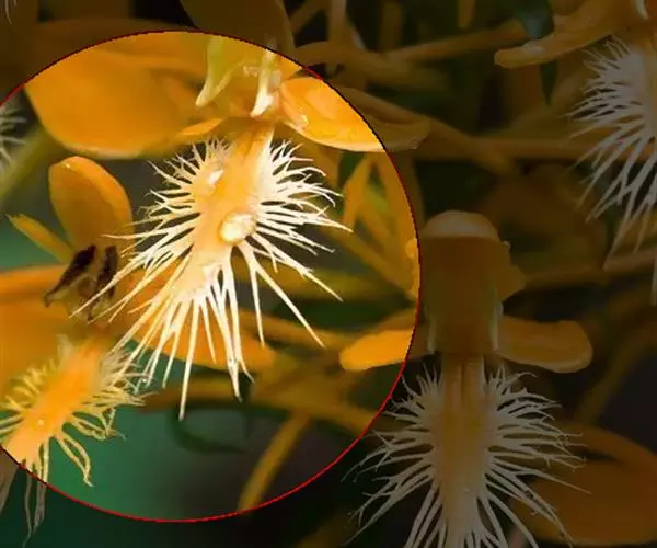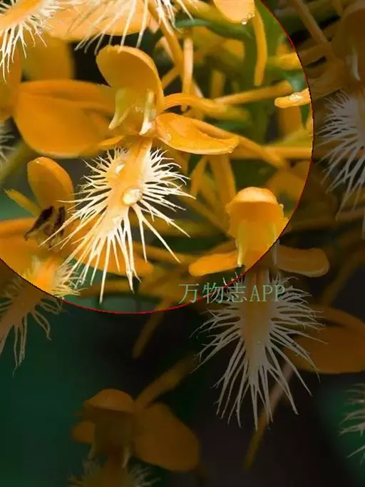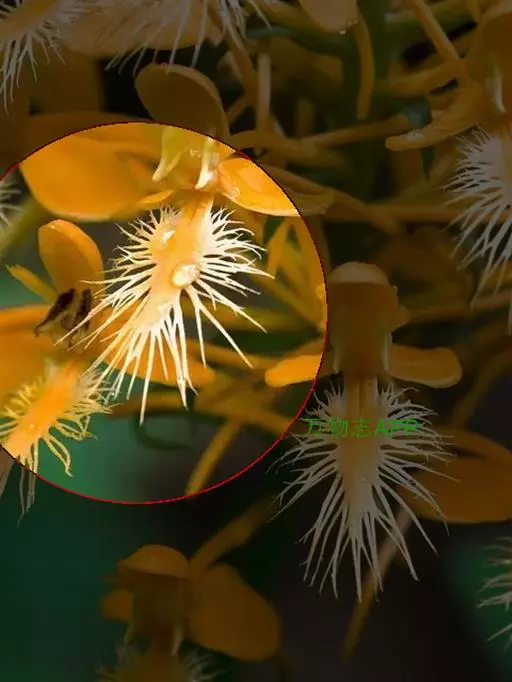 花瓣长圆形,长2.5厘米,宽7毫米,先端钝,具7条脉,全缘;唇瓣卵状三角形,长2厘米,宽15毫米,先端稍钝,基部具短爪,上面密布短绒毛,中部以下边缘具短流苏,中部以上(尤其先端)边缘具长而分枝的流苏,先端的流苏比唇瓣长;蕊柱黄色而上端两侧白色,长约3毫米;药帽浅黄白色,狭圆锥形,长约5毫米,密布细乳突,前端边缘稍不整齐。
