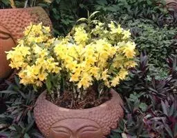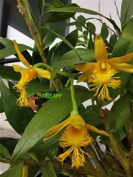 长苏石斛(学名:Dendrobium brymerianum Rchb.f.):茎直立或斜举,不分枝,具数个节。叶薄革质,常3-5枚互生于茎的上部,狭长圆形。总状花序侧生于去年生无叶的茎上端,近直立,具1-2朵花;花质地稍厚,金黄色,开展;花瓣长圆形,长2.5厘米,宽7毫米,先端钝,具7条脉,全缘;唇瓣卵状三角形,基部具短爪,上面密布短绒毛,中部以下边缘具短流苏。蒴果长圆柱形,具6条棱。花期6-7月,果期9-10月。