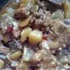 ②再放入剁好的豆豉末(喜欢有点辣味的我还在剁豆豉的时候加了点辣酱一起剁哩)、辣椒粒、一点盐、白糖、生抽、蚝油、胡椒粉改小火来炒,看着水分有点干了,再下点料酒继续炒香它即可。