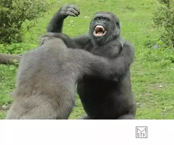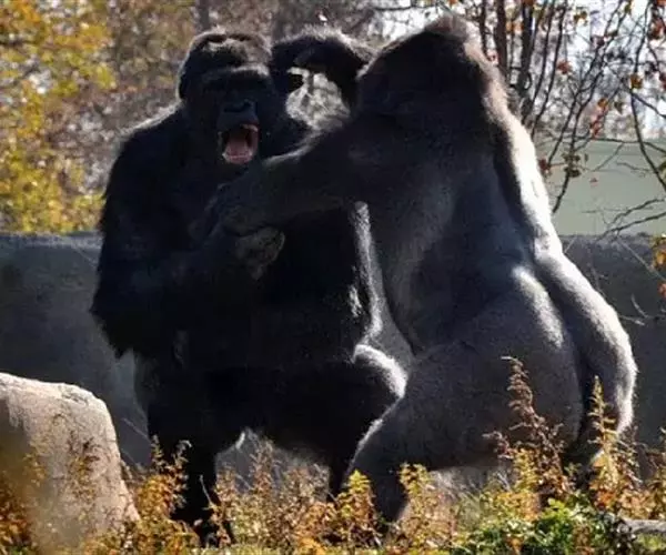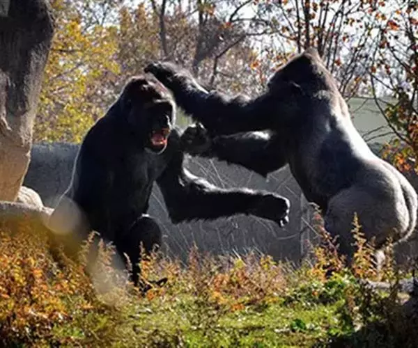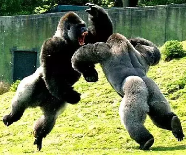 在稳定的山地大猩猩族群中很少有严重的侵略,但当两个族群相遇时,两头雄性领袖有时会打斗起来,以犬齿咬伤对方,直至另一方死亡为止。故此,很多时纠纷都在展示威吓前就得到解决。它们的威吓仪式是非常独有的:逐渐加快的叫嚣;象征性地吃东西;双脚站立;抛掷植物;以双拳捶胸;单脚踢;双足或四足向两侧走动;撕开植物;最后以手掌大力的捶地。