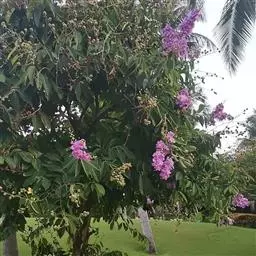 大花紫薇别名大叶紫薇。为同属常见种。半落叶乔木,叶柄短。叶革质,矩圆状椭圆形或卵状矩圆形,长10~25厘米,宽6~10厘米。花淡红色、红紫色。花期夏秋季,花期较长。