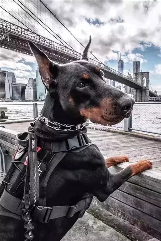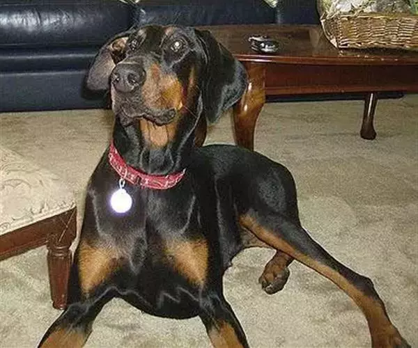 耳朵始终保持立起。暗褐色的眼睛中等大小、且呈椭圆形。鼻端是黑色的。胸很深厚,腹部收起。四肢细长有力,弹跳的能力十分好。又细又长的尾巴向下垂坠着,有点像军刀,有的杜宾犬的尾巴被断了,大约只保留5cm的长度 。