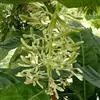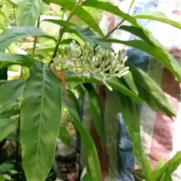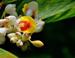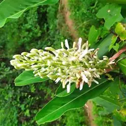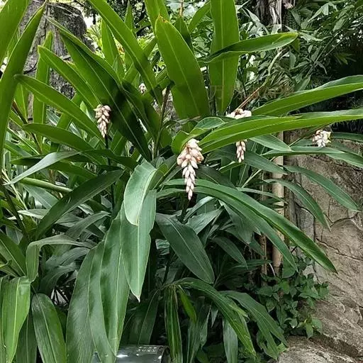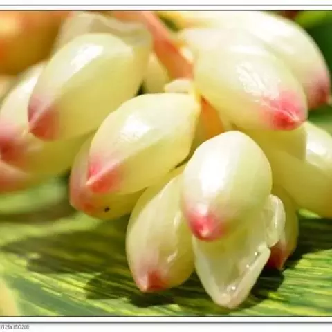 艳山姜(学名:Alpinia zerumbet (Pers.) Burtt. et Smith):姜科山姜属植物,株高可达3米,叶片披针形,基部渐狭,边缘具短柔毛,两面均无毛;圆锥花序呈总状式,下垂,花序轴紫红色,分枝极短,小苞片椭圆形,白色,顶端粉红色,蕾时包裹住花,裂片长圆形,乳白色,顶端粉红色,唇瓣匙状宽卵形,子房被金黄色粗毛;种子有棱角。4-6月开花;7-10月结果。