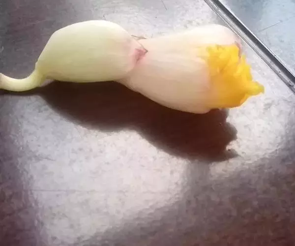 圆锥花序呈总状花序式,下垂,长达30厘米,花序轴紫红色,被绒毛,分枝极短,在每一分枝上有花1-2(3)朵;小苞片椭圆形,长3-3.5厘米,白色,顶端粉红色,蕾期包裹住花,无毛;小花梗极短;花萼近钟形,长约2厘米,白色,顶粉红色,一侧开裂,顶端又齿裂;花冠管较花萼为短,裂片长圆形,长约3厘米,后方的1枚较大,乳白色,顶端粉红色,侧生退化雄蕊钻状,长约2毫米,唇瓣匙状宽卵形,长4-6厘米,顶端皱波状,黄色而有紫红色纹彩;雄蕊长约2.5厘米;子房被金黄色粗毛;腺体长约2.5毫米。