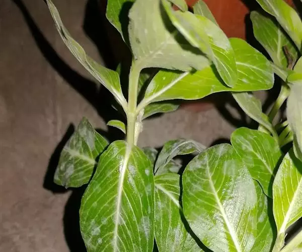 【症状】该病主要为害叶片,也可蔓延至嫩茎、花、果。感病的叶片最初在叶表面上出现零星不规则状的白色粉块,随着病害的发展,叶面逐渐布满白色粉层。初秋,在白粉层中形成黄色小圆点,后逐渐色变深呈黑褐色。病叶后期变枯黄、扭曲。