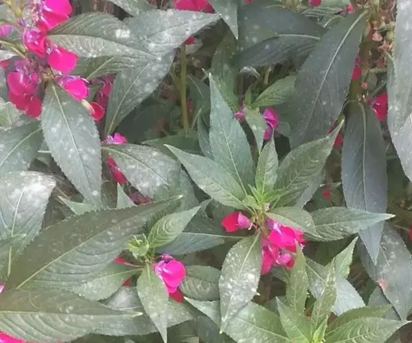 (图)凤仙花 【病原及发病规律】病原为单丝壳菌(Sphaerotheca fuliginea)。病菌在凤仙花的病残体和种于内越冬,翌年发病期散放子囊孢子进行初次浸染。以后产生分生孢子进行重复浸染。借风雨传播。8~9月为发病盛期,气温高、湿度大、种植过密。通风不良发病重。