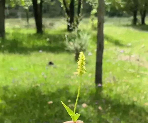 总状花序具多数花,圆柱状,长达15厘米;花苞片线状披针形,长2.5毫米,宽约1毫米,先端长渐尖,尾状,直立伸展;子房圆柱状纺锤形,扭转,顶部明显钩曲,无毛,连花梗长4-5毫米;花小,黄绿色,垂头,萼片近等长,具1脉;中萼片椭圆形或长圆状披针形,长2.2毫米,宽1.2毫米,先端钝;侧萼片长圆状披针形,宽约1毫米,较中萼片稍狭,先端稍尖。