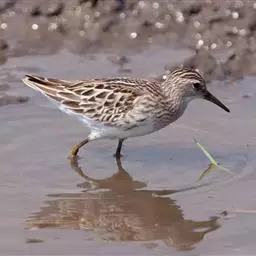 阔嘴鹬是涉禽,体长17厘米。特征为翼角常具明显的黑色块斑并具双眉纹。与黑腹滨鹬平滑下弯的嘴相比,…