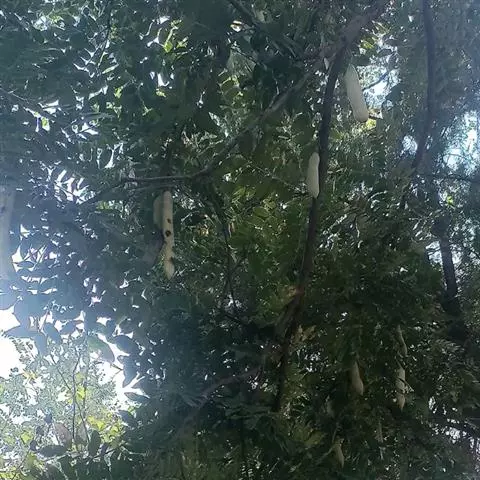 荚果圆柱形,长30-60厘米,直径2-2.5厘米,黑褐色,不开裂,有3条槽纹;种子40-100颗,为横隔膜所分开。花期6-8月;果期10月。