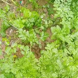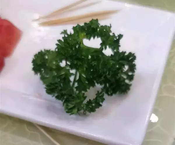 ③皱叶香芹和矮生皱叶 香芹:叶缘缺刻细、深裂而卷曲,并成三回卷皱,如重瓣鸡冠状。矮生皱叶香芹的基生叶成簇平展生长,叶片呈宽厚的羽毛状。外观雅致,用于作“青枝绿叶”装饰菜肴或沙拉。