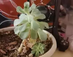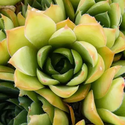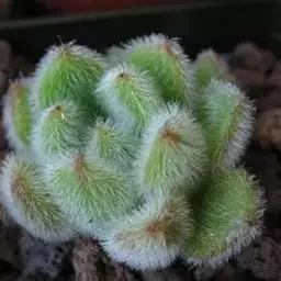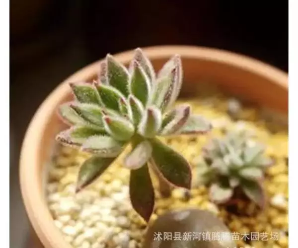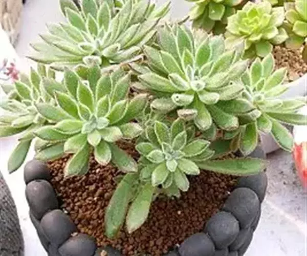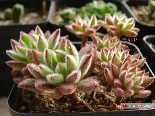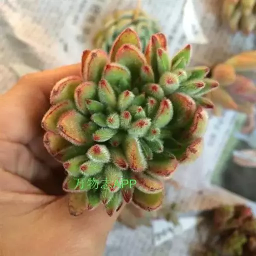 少数带绒毛的石莲花之一,与“锦晃星”类似。有红棕色绒毛。肥厚、多肉的叶片倒披针形,呈莲座状互生于分枝上部,而栽培多年植株基部的叶片常脱落,叶片绿色,表面密被白色、细短毫毛,在冷凉时期阳光充足的条件下,叶缘及叶片上部均呈深红色。很美丽。