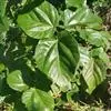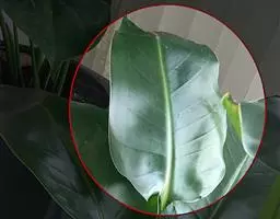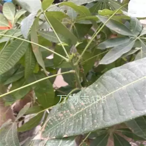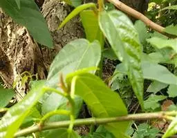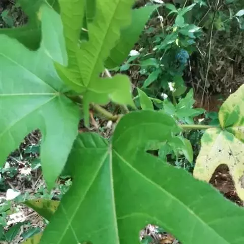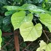叶革质,三角状卵形,长9-17厘米,宽8-12厘米,表面深绿色,光亮,背面绿色,先端骤尖,顶部延伸为尾状,尾尖长2-5厘米,基部宽截形至浅心形,全缘或为波状,基生叶脉三出,侧脉5-7对;叶柄纤细,有关节,与叶片等长或长于叶片;托叶小,卵形,先端急尖。