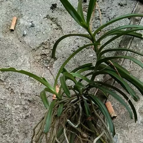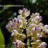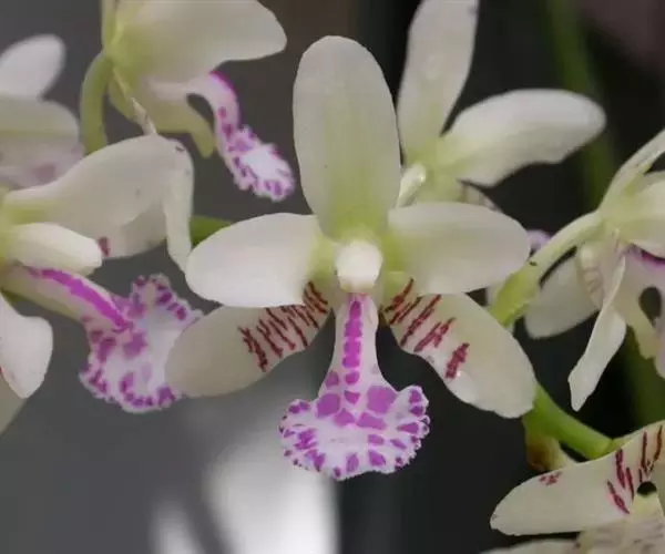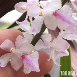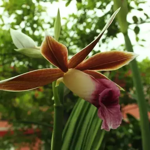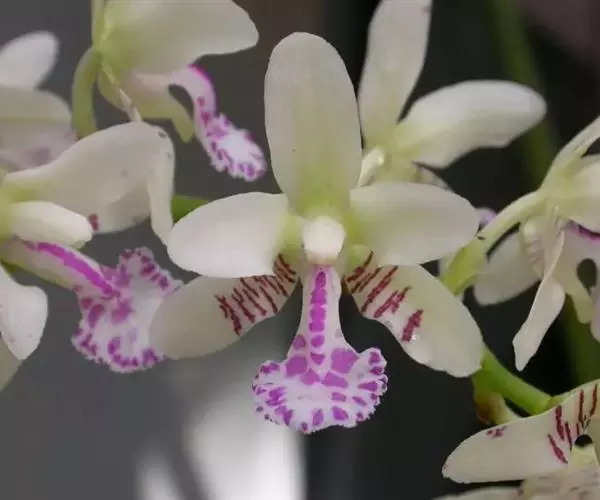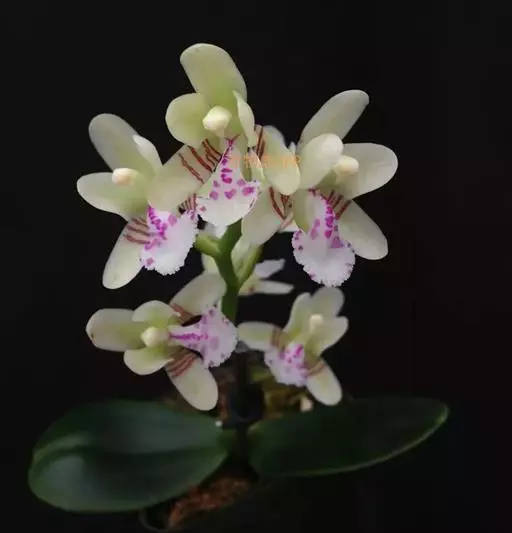 总状花序长18厘米,下垂,疏生6朵花;花苞片淡褐色,宽卵形,凹的,长约8毫米,先端钝,花梗和子房长约18毫米;花具橘子香气,萼片和花瓣白绿色;萼片长圆形,长1.7厘米,宽7.5毫米,先端钝;侧萼片比中萼片稍窄,在基部上方内面具1-3个污褐色横向斑点。