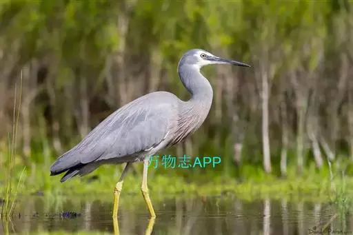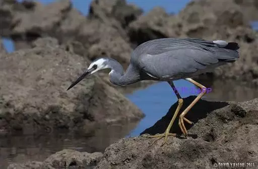 白脸鹭(学名:Egretta novaehollandiae):体长60-70厘米,体重550克。成鸟相对其他鹭科鸟类要小,正如它的名字,很容易通过白脸鹭的蓝灰色身体和独特的白脸来识别。嘴长而尖直,翅大而长,脚和趾均细长,胫部部分裸露,脚三趾在前一趾在后,中趾的爪上具梳状栉缘。雌雄同色。整体基本由三种羽毛苍白、蓝色和灰色组成。 前额、冠、下颏和上部喉头是白色的。顶冠颜色易变,白色有时沿着颈部延伸到脖子下。虹膜可以是灰色、绿色、暗黄色或桂香色,这些变化因个体而异。