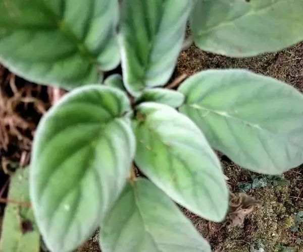叶近膜质,有细腺点,下部的阔卵形或近圆形,长7-14厘米,宽6-13厘米,顶端短尖,基部心形或稀有截平,两侧近相等,腹面无毛,背面沿脉上被极细的粉状短柔毛;叶脉7条,干时呈苍白色,背面显著凸起,最上1对离基1-2厘米从中脉发出,弯拱上升至叶片顶部与中脉汇合,最外1对有时近基部分枝,网状脉明显;上部的叶小,卵形或卵状披针形,基部浅心形、圆、截平或稀有渐狭;叶柄长2-5厘米,被极细的粉状短柔毛,匍匐茎的叶柄长可达7-10厘米;叶鞘长约为叶柄之半。