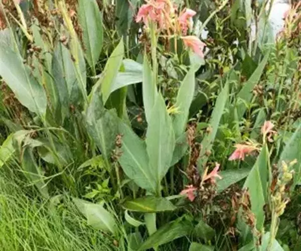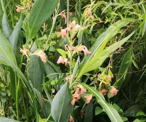 粉美人蕉(学名:Canna glauca L.):是一种球根草本植物。根茎延长,株高1.5-2米;茎绿色。叶片披针形;总状花序疏花,单生或分叉,稍高出叶上;苞片圆形,褐色,花黄色,无斑点;有多种园艺栽培品种,颜色从粉、橙红色及具带红色斑点等。花期:夏、秋。