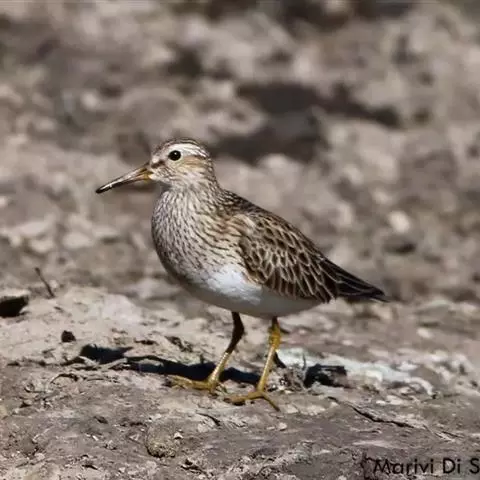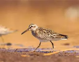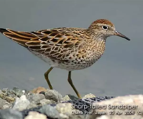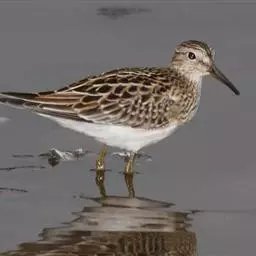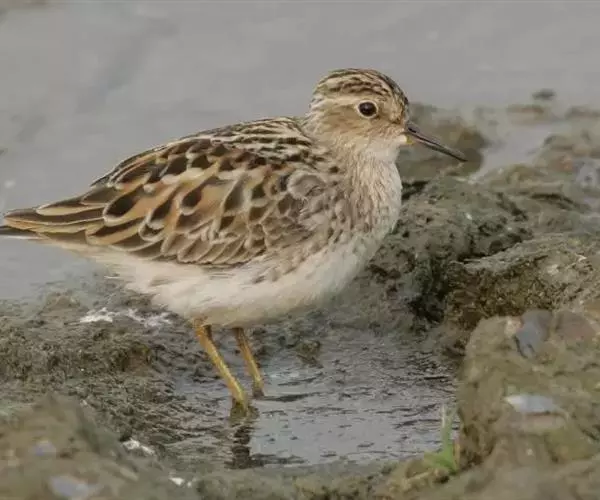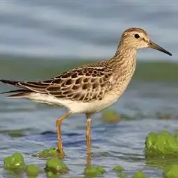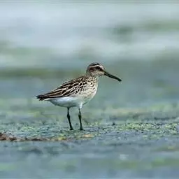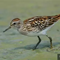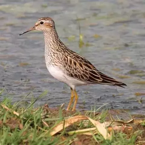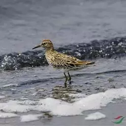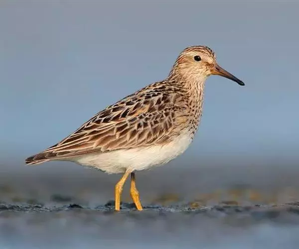 斑胸滨鹬(学名:Calidris melanotos)小中型涉禽;体长23厘米,翼展37-45厘米,体重126克。嘴形直,有时微向上或向下弯曲;鼻沟长度远超过上嘴的1/2;羽色暗淡,雌雄羽色及大小大都相同;跗蹠后侧具盾状鳞,前缘亦具盾状鳞;趾不具瓣蹼。体羽多具褐色杂斑,腿黄,嘴具两色并略为下弯,胸部纵纹密布并突然中止于白色腹部。白色眉纹模糊,顶冠近褐。繁殖期雄鸟胸部偏黑。栖息于海岸、沼泽、河川等地。飞翔力强,飞行时颈与脚均伸直。取食甲壳动物、昆虫和植物。栖于沿海滩涂及近海的稻田和鱼塘。通常与其他滨鹬及鹬类混群。潮落时跑至泥里翻找食物。休息时单脚站在沙坑,飞行迅速,成密集群。繁殖于西伯利亚东北部楚利奇半岛和北美洲北部北极地带。越冬于南美洲、美国东西海岸、夏威夷群岛、澳大利亚、太平洋中岛屿,偶尔到日本。