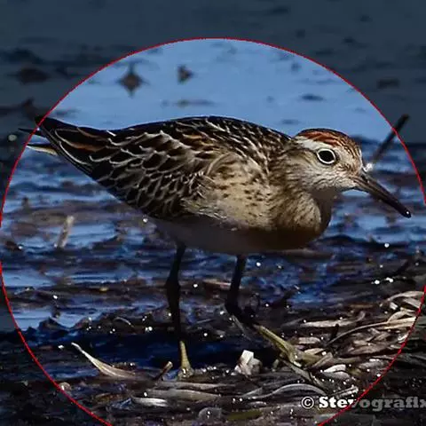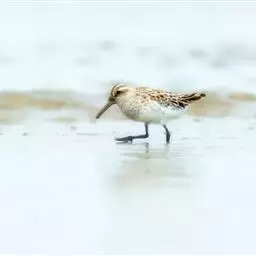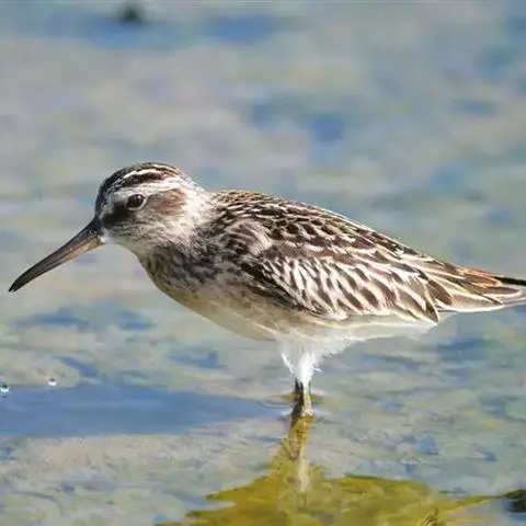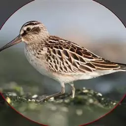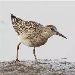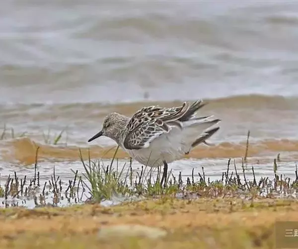 阔嘴鹬是涉禽,体长17厘米。特征为翼角常具明显的黑色块斑并具双眉纹。与黑腹滨鹬平滑下弯的嘴相比,…