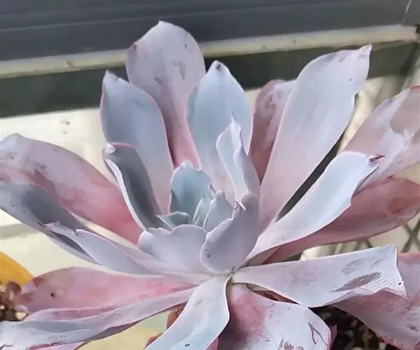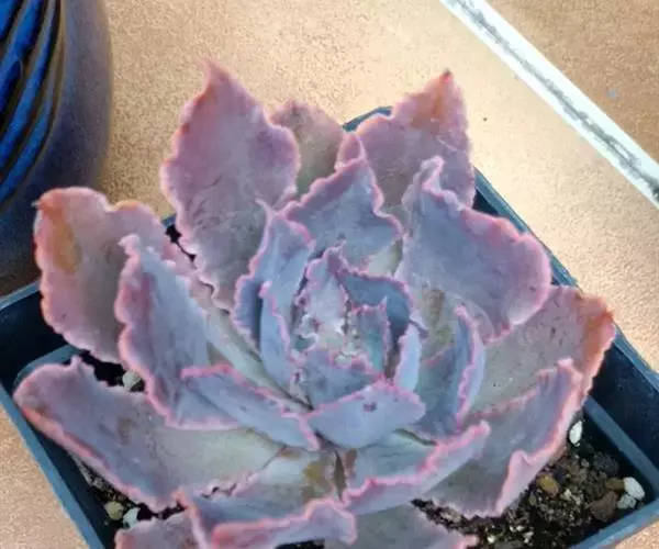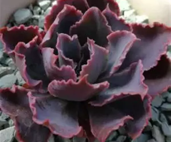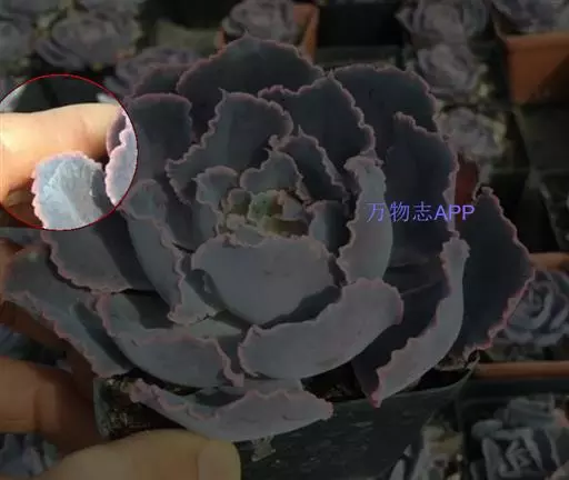 外形雍容大气,阳光充足时颜色呈紫红色,叶片宽大,微微向内卷起,表面有一层细细的粉。
