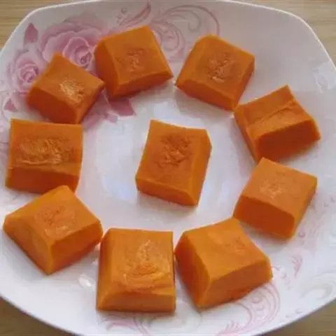 1、南瓜去皮、洗净、切丁,红枣(枸杞)用温水发开待用。