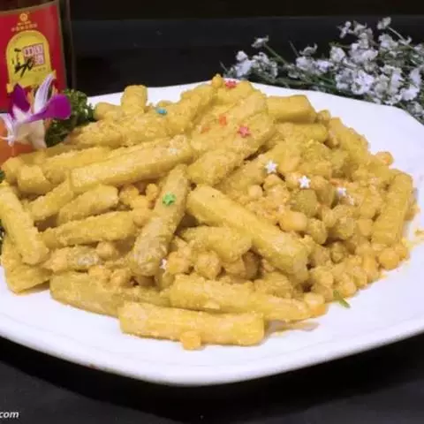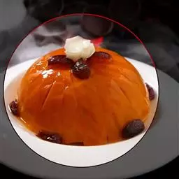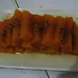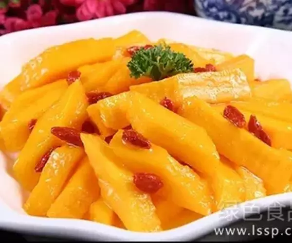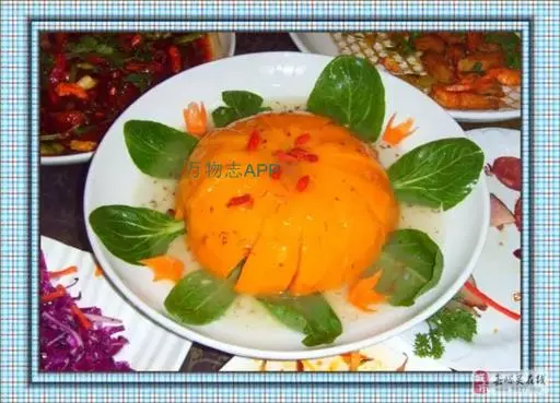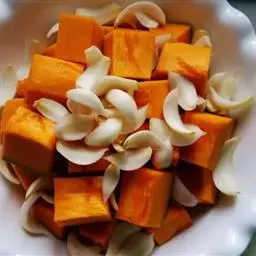 用陕北优质八棱南瓜,削皮去籽,平刨两半,在顺天然瓜沟切成若干小瓣,拼复完整,入锅蒸熟后,浇以糖汁。口感绵软,香甜怡人。