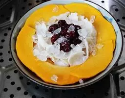 2、切好的南瓜片整齐放入盘里,加入蜜枣、枸杞、白果、生姜片,入蒸笼蒸15分钟。
