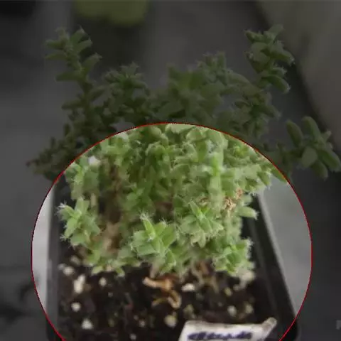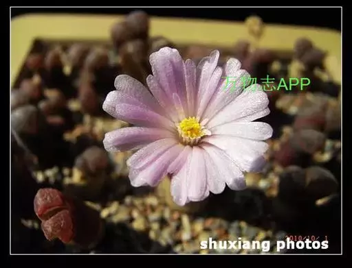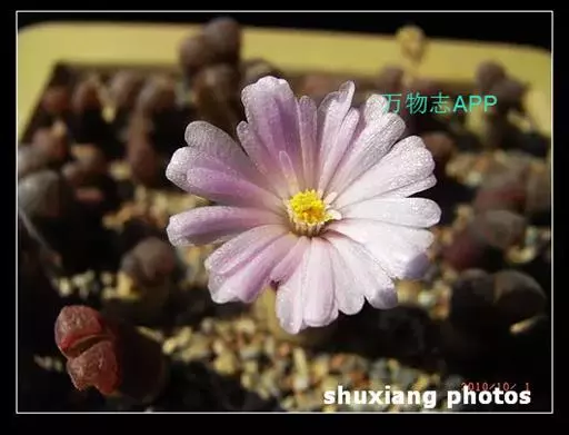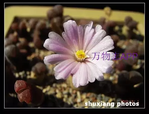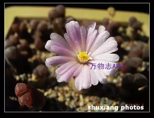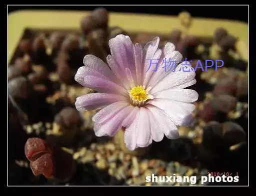 植株单生或群生,单株由对生的极端肉质叶组成近似圆柱体,高2一3厘米,其中下部表皮呈红褐色或白绿色中带有红色。顶端圆凸,表皮极薄,较为光滑,几乎接近透明状,俗称”窗”,光线由此进入植株体内进行光合作用。顶端有一浅缝隙,9一11月初从这里开出直径约2厘米的白色花朵。花通常在天气晴朗的白天开放,傍晚闭合,若遇阴雨天或栽培场所光线不足,则不能开放。