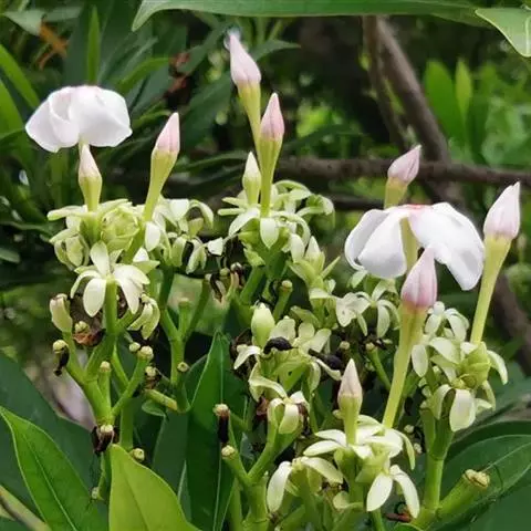 狗牙花 R. Br. ex Roem. & Schult.)是夹竹桃科山辣椒属灌木植物;枝灰绿色;叶椭圆形或椭圆状长圆形,叶面深绿色,背面淡绿色,叶面扁平;花聚伞花序腋生,通常双生,萼片长圆形,边缘有缘毛,花冠白色;果长圆形;花期六至十一月;果期秋季。狗牙花因其花冠裂片边缘有皱纹,状如狗牙,故名。狗牙花原产于印度及中国云南,在广西、广东、台湾及亚洲热带和亚热带等地区广泛栽培。狗牙花喜温暖湿润,不耐寒,宜半阴,对土壤要求不严,喜肥沃、排水良好的酸性土壤,常生长于山地灌木丛中。狗牙花的主要繁殖方式为扦插。狗牙花味酸、凉,有清热降压、解毒消肿的功效,可用于治疗咽喉肿痛,跌打损伤。狗牙花枝叶茂密,株型紧凑,花朵净白素丽,典雅朴质,盛花时十分美观,且花期长,具有一定观赏价值。狗牙花还有较高的经济价值,园林中应用极为普遍,可丛植于林缘、路